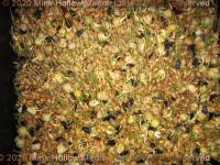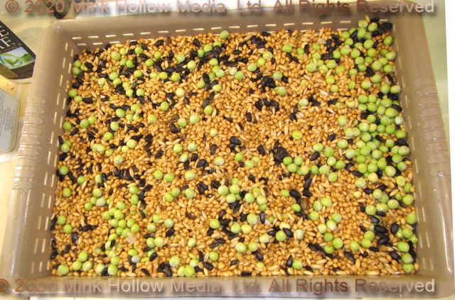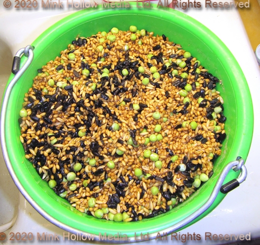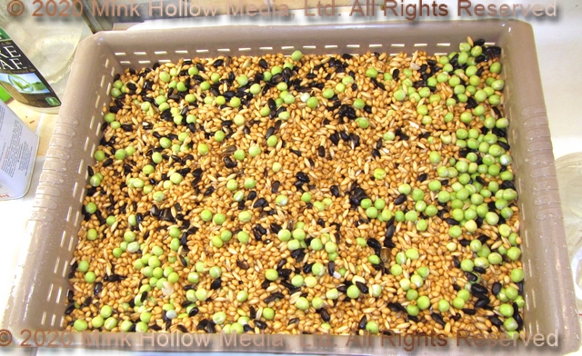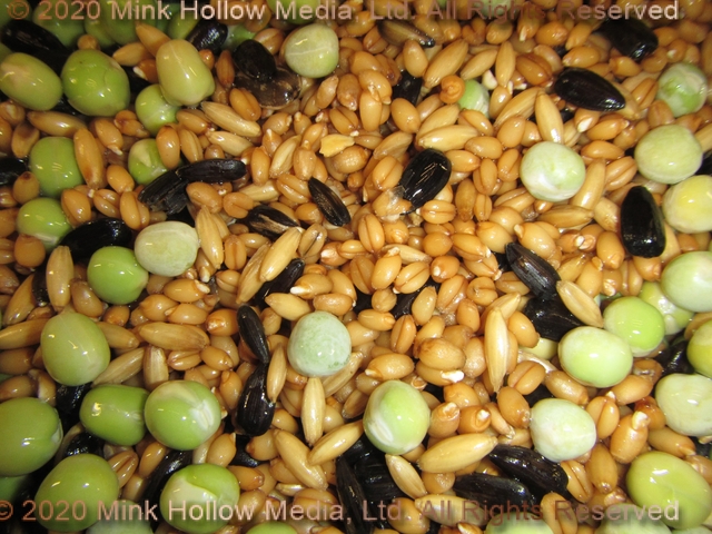 Each batch consists of 4-6 cups of wheat, 2 cups each of: oats, black oil sunflower seeds, and green peas.