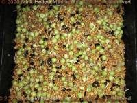 This is what it looks like after 1 day of soaking and 1 day of sitting. If you look closely, you can see that the wheat has already sprouted, AND you can see that the sprouts from the peas are just about to burst out of the pea.