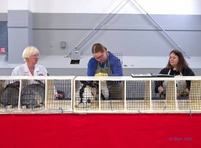 The judge will first look over all 3 black senior bucks. They will check for disqualifying faults and then assess the rabbit's overall quality. They often don't say much about the rabbits at that time.