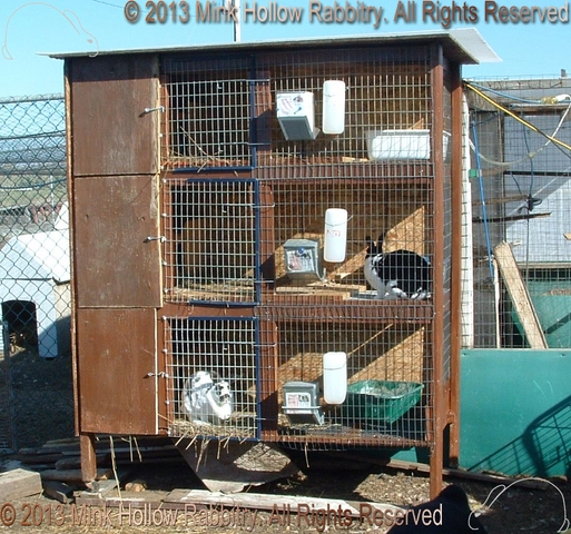 They all had a solid (removable) bottom on the left side with a shelf above that they could sit on. Before we had an indoor rabbitry we would cover the wire fronts with corrugated plastic in the winter using mirror clips as fasteners (and before that I cut up an old tent and made shades that I could roll down and fasten to the bottom).