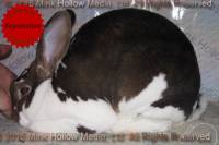Buddy is carrying chin (magpie). Buddy is a large, solid buck, but is not eligible for registration because Harlequin is an unrecognized color in Rex. Buddy is a sweetie - but for some reason hates being touched under his chin. Other than that, he's calm, curious, and has great type. His fur is dense, but somewhat soft. He is the only offspring we have from Willow. |