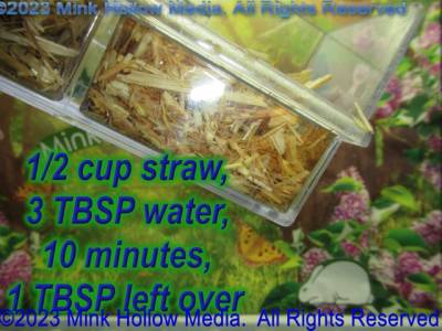 Since the wood pellets are far more dense than either the shavings or straw, I measured out one tablespoon of pellets and used that. I still added 3 table spoons of water, and let it sit for 10 minutes.