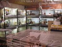 These are my regular stackers. They are 36” wide, 30“ deep, and 18” high (7.5 sq. ft.). The boys live in the bottom holes (some boys like to spray, so the bottom holes also have dividers between the cages).I use these for everything except does with older litters (> 5 or 6 weeks, depending on how many were in the litter). I also have lighting above each hole so I can see the rabbits easily. |