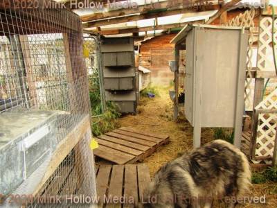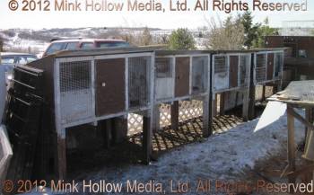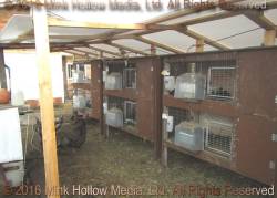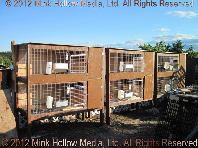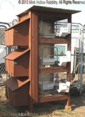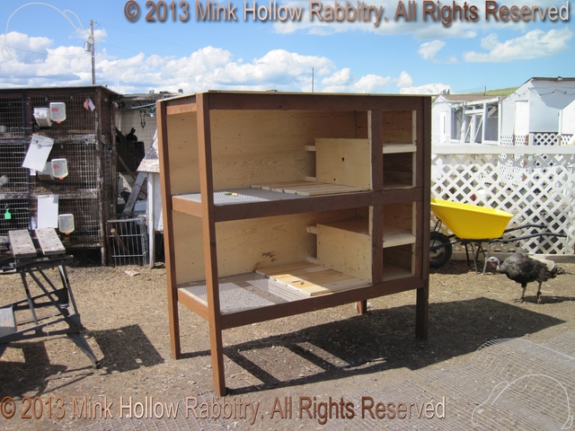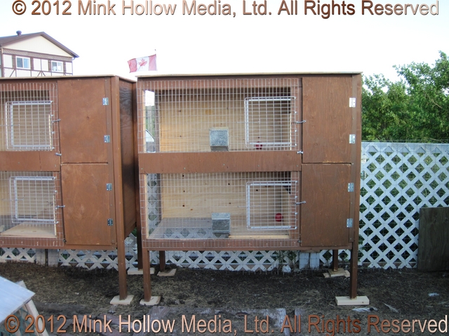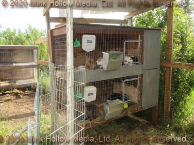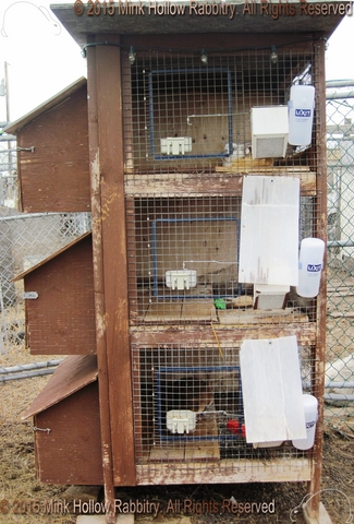 They all had a solid (removable) bottom on the left side with a shelf above that they could sit on. Before we had an indoor rabbitry we would cover the wire fronts with corrugated plastic in the winter using mirror clips as fasteners (and before that I cut up an old tent and made shades that I could roll down and fasten to the bottom).