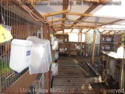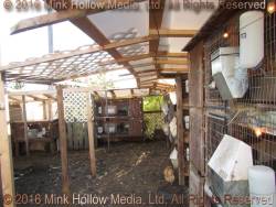 In addition to the misting system, we now (2016) have roofing over the hutches. It is slightly pitched, but does not attach directly to the backs of the hutches so that the wind can flow through, increasing the cooling effect. It also solves the problem of the feeders getting wet.