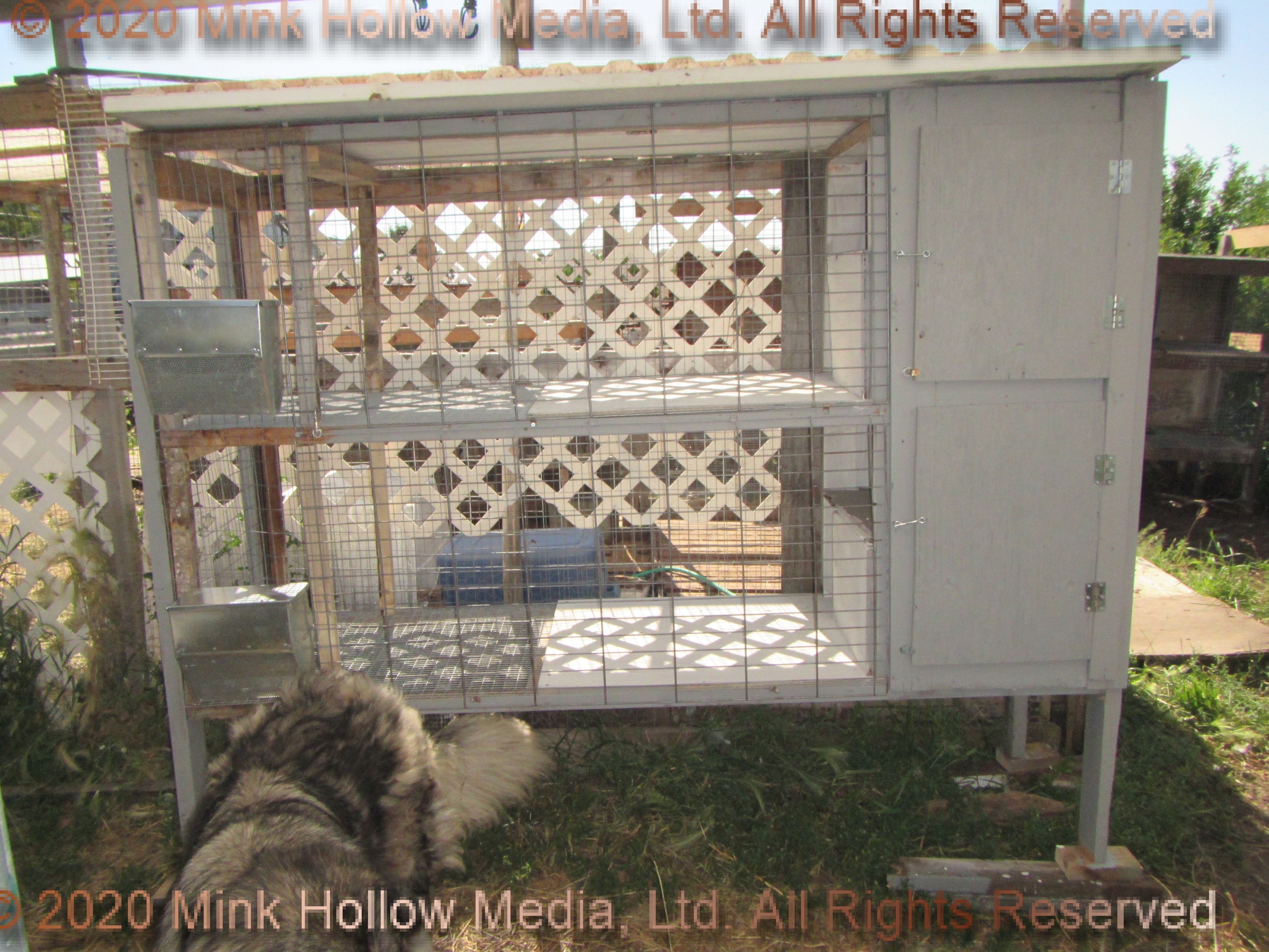This is a triple-decker, 36×30 with a house off the far side. I originally built these as a 2×4 frame for some all wire cages I bought second hand (around 1998). When the all wire cages got too rusty and beat up, I saved the parts of the wire that was still good, and rebuilt the frame into hutches. There are covers over the feeders (made of corrugated plastic) to keep out the rain. The top one doesn't need one because the roof hangs over.