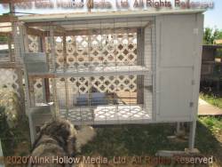 This is my newest hutch, built this year (2020). I measures 6 1/2' x 2' (with shelves it's about 15sq.ft.). Like my others, it has 2 levels, the floor is partly solid and partly wire. There is an enclosed area with 2 levels - the upper level is open on one side, and the lower level has a small opening, but is otherwise fully enclosed. Unlike the other hutches, the open area is open on both sides, and the entire near side opens for easy catching and cleaning. The side that opens is made from a 4'x2' dog expen panel. The reason it is 6 1/2'x 2' is that I used a 2×4' plywood bottom together with a piece of 24”x30“ heavy-gauge 1”x1/2“ floor wire. Together they make a nice, solid bottom. The rest of the unit is built using re-claimed wood and hardware (even the screws) from an old chicken coop and old duck/rabbit runs.