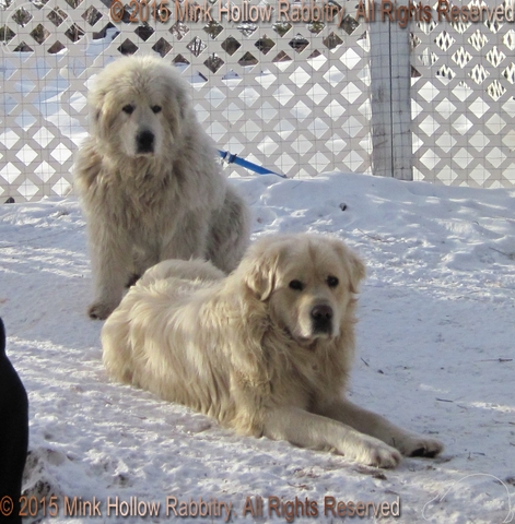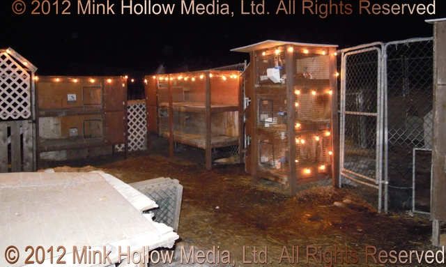 This is the outdoor rabbitry at night. I use Christmas lights on a timer to provide lighting so I can see when I do chores. I also have two big boys (Arrow and Odin) who keep my bunnies safe 24/7.