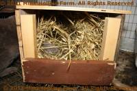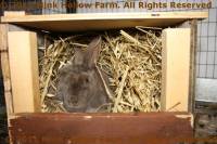 I use either wooden nest boxes with lids or plastic storage bins (about 18“ x 12” x 8“ high) with a 6” hole cut in one side and the lid on (see the photos on the housing page). I set that on top of a piece of plywood so there are several layers of something between the babies and the cage wire. Remember that babies wiggling around will often end up on the bare floor of the nestbox so it’s important that that not be metal. My nest boxes are big enough that the does can sit inside next to the babies without sitting on them. Many of my does sit near the babies when it's really cold. I make sure the does have plenty of straw for bedding.