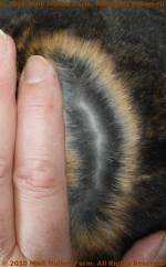 The color concentration gene controls the amount of pigment in the hair; relative amounts shown as units of black 'B' and yellow( or red) 'Y' color. Imagine that the total amount of pigment in hair is the same for all hairs. As a result, shorter hairs appear darker (and also why long-haired varieties look faded). This explains the shading pattern found in seals, sables, torts, and the pointed colors. The color pattern of the chinchilla (Cchd) is essentially the same as that for the agouti except that is lacks the reddish color in the mid-band.